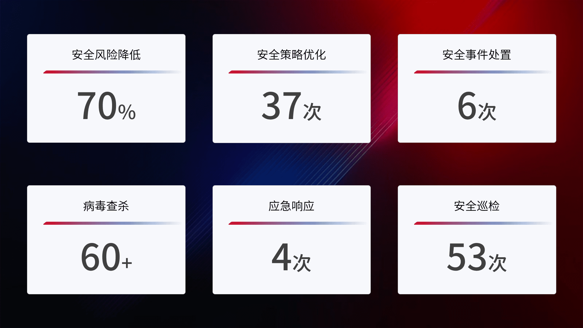 提供全面的安全事件报告体系,,包括处置报告、、周报、、季度和年度总结,,,,结合持续监控,,,,帮助客户深入了解网络安全状况。。。。